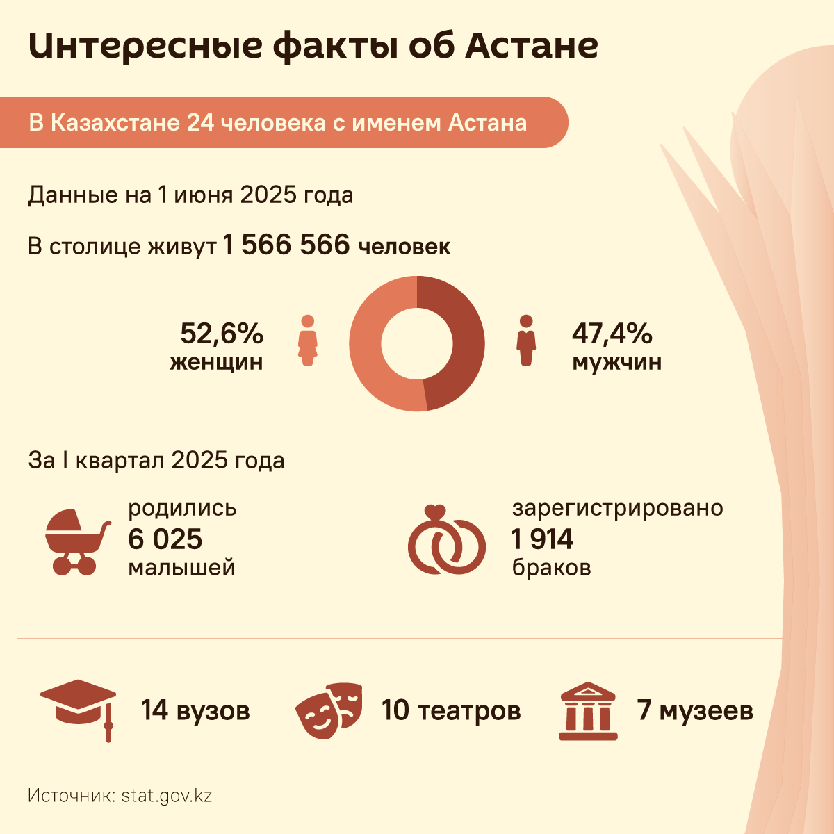 ️Численность населения на 1 июня 2025 года – 1 566 566 человек, причем женщин в столице живет больше, чем мужчин: 823 766 против 742 800. За первый квартал в столице браком сочетались 1914 пар, на свет появились 6 025 малышей. В Астане работают 14 вузов, 10 театров, 7 музеев. Казахстан празднует День столицы6 июля, 09:00